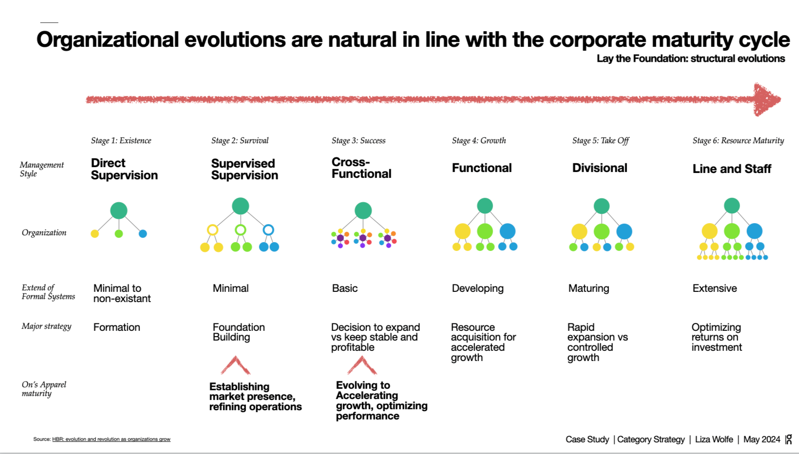 Every organization moves through a predictable maturity cycle as it scales. On's apparel business sits between Stage 2 and Stage 3 on the HBR model, establishing market presence, refining operations, beginning to accelerate. The structural evolution required to move toward Stage 4 and beyond isn't optional and it isn't linear. It means moving from supervised supervision to cross-functional management, developing formal systems, and making deliberate resource acquisition decisions. The pattern engineers, 3D specialists, and fit specialists aren't headcount — they're the infrastructure that makes speed and quality coexist at scale. Building that team ahead of demand is what separates brands that scale well from brands that scale chaotically.
