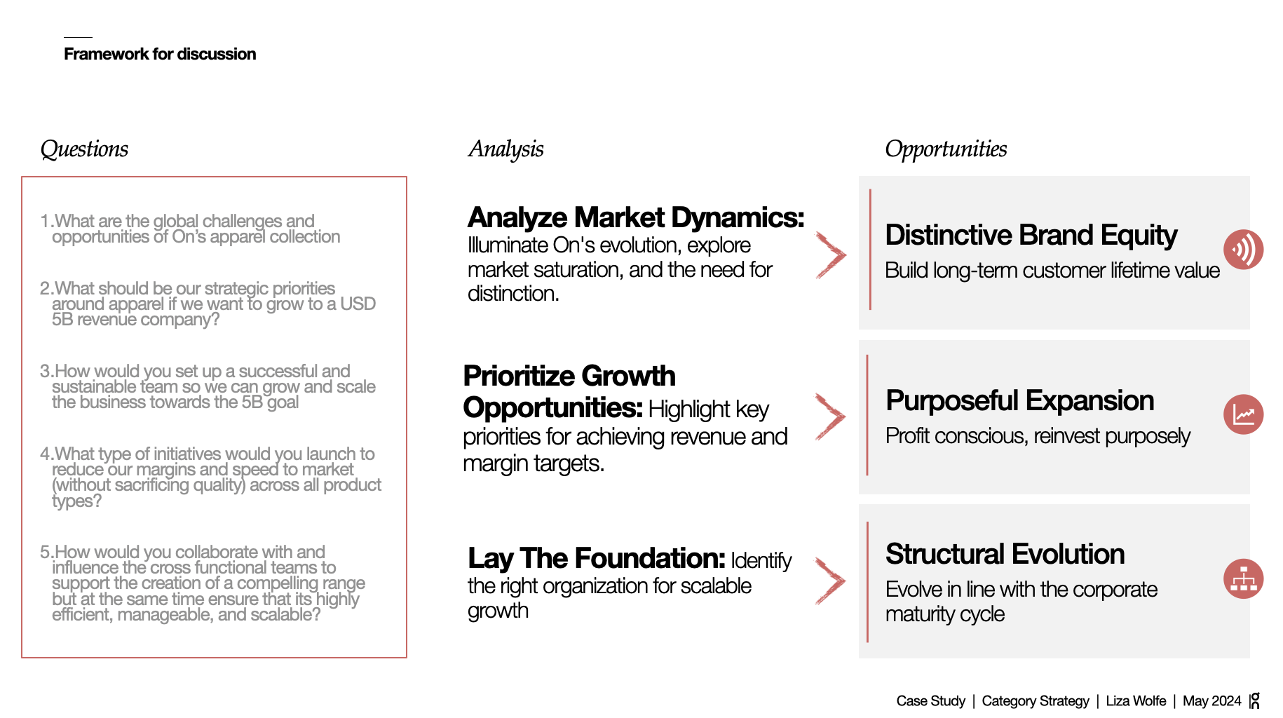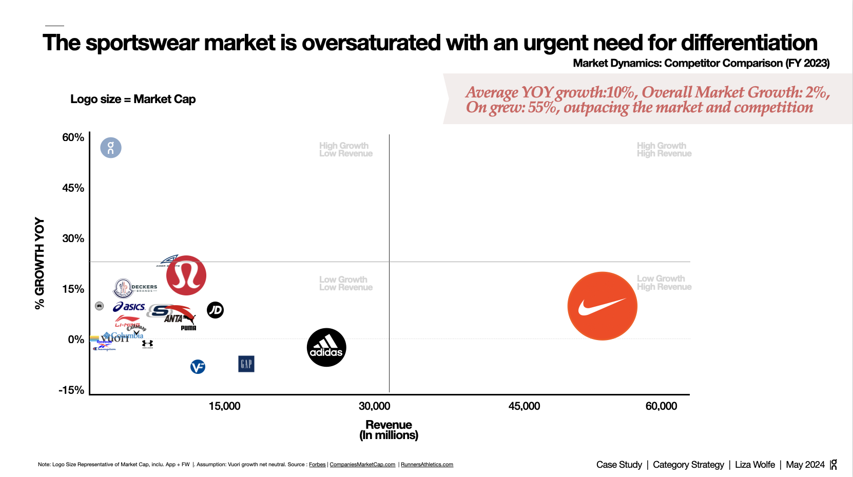 On asked five questions about scaling apparel to $5B. This is the framework I built to answer them, covering market dynamics, competitive positioning, brand architecture, organizational design, and growth sequencing. The work reflects how I think about category strategy: start with what the market is telling you, identify where the brand has permission to grow, and build the infrastructure that makes scaling possible without losing what made the brand worth scaling in the first place.