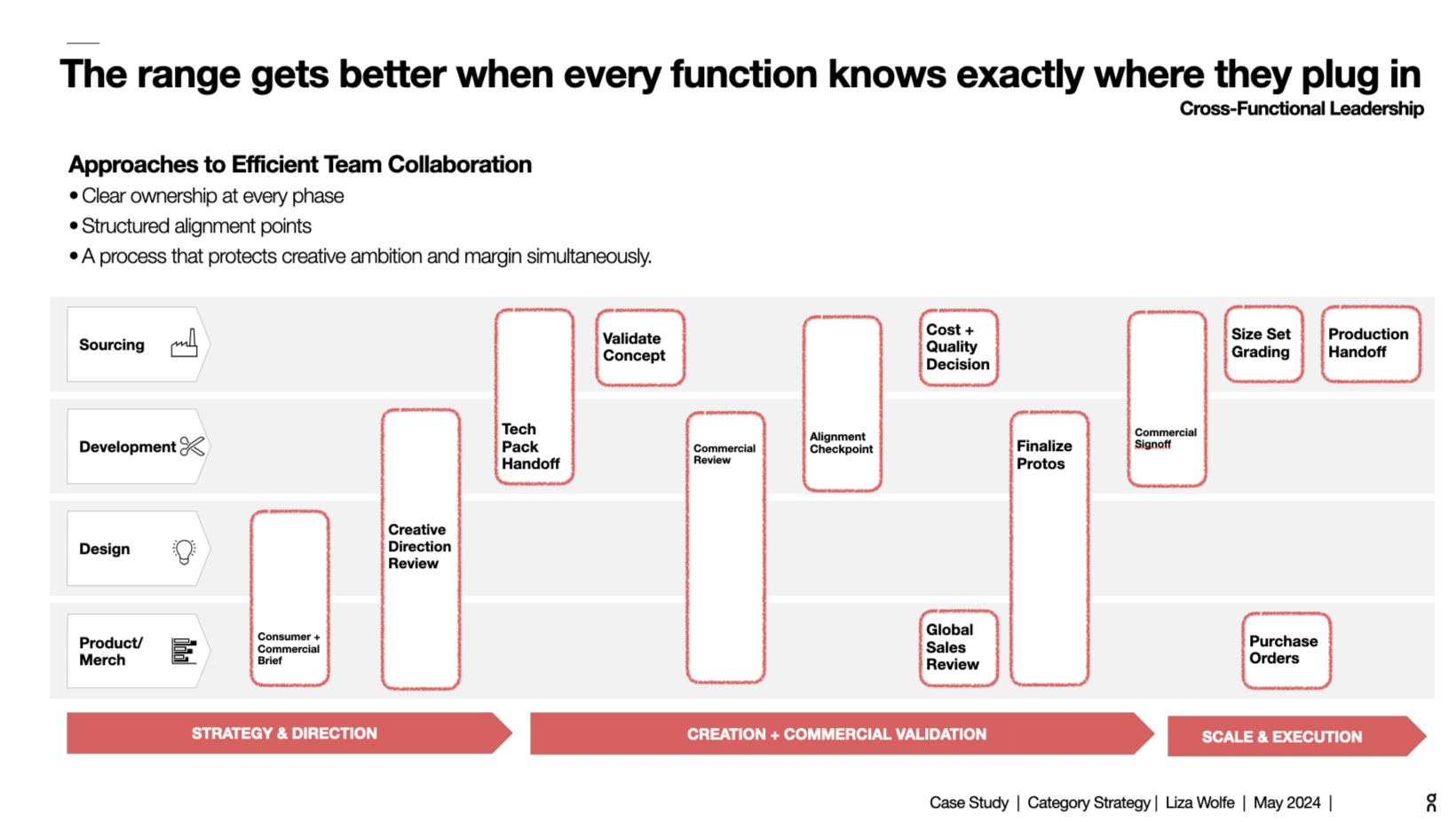 The conversations that determine whether a range succeeds happen long before production starts. Design needs to know what's feasible before committing to a creative direction. Merchandising needs technical context to make margin-informed assortment decisions. Sourcing needs standards and specifications early enough to influence cost and lead time. Development needs commercial grounding to push back on complexity that doesn't add consumer value. When those conversations happen in sequence — each function waiting for the one before it to finish — speed slows, cost rises, and the product that reaches market is a compromise. When they happen in parallel, with shared visibility into the consumer need and the commercial target, the range gets sharper, faster, and more profitable. That's the operating model I build.
