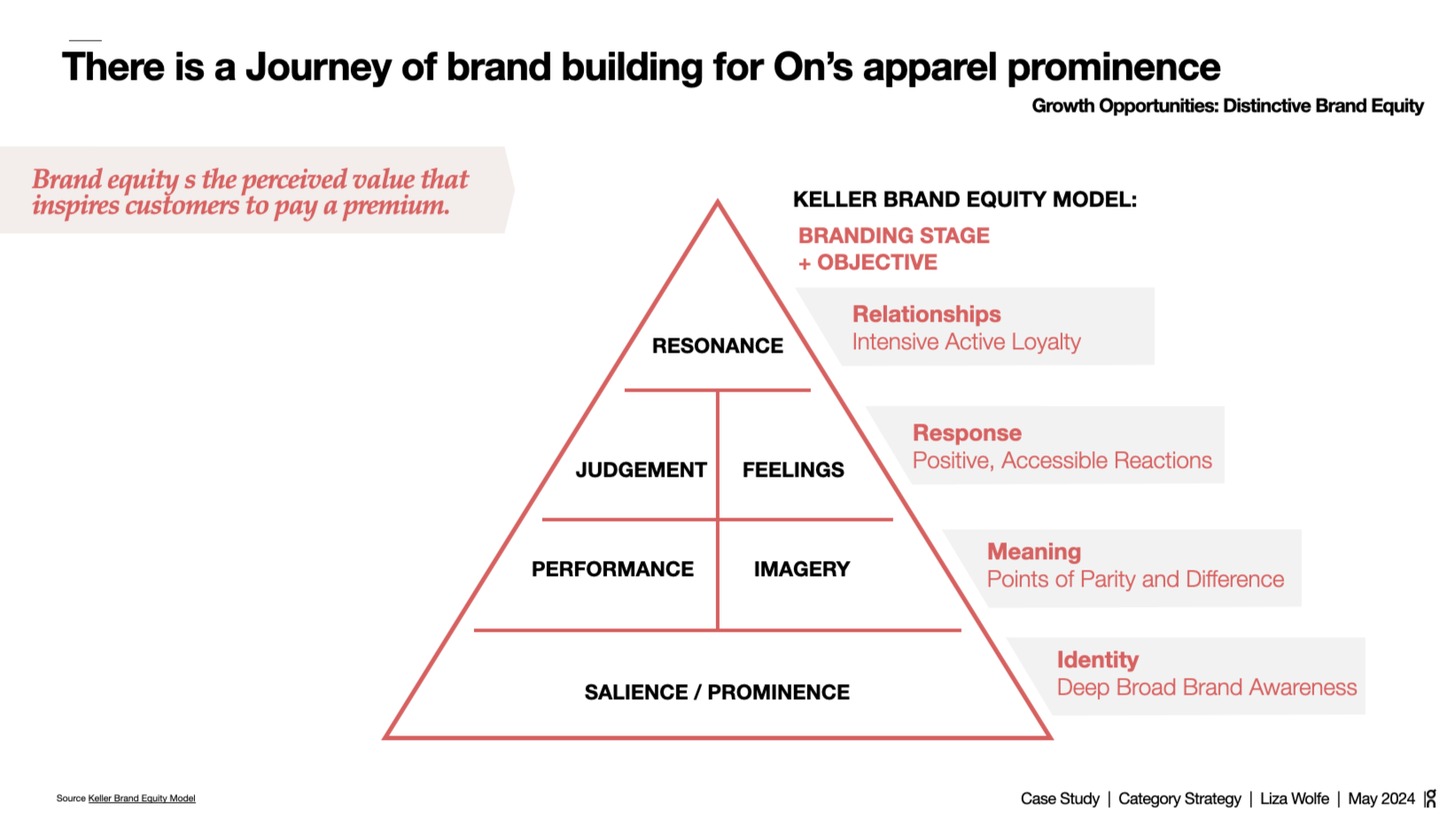 Brand equity isn't transferable between categories automatically. The Keller model makes this visible — salience, performance, imagery, judgment, feelings, resonance are a sequence, not a menu. On's apparel business is at the identity stage: building deep, broad awareness from scratch with a consumer who already knows the footwear brand but hasn't been given a reason to consider the apparel. The strategic implication is that apparel needs its own brand-building investment, its own franchise anchors, its own performance credibility, its own emotional associations. Leveraging footwear equity gets you in the door. It doesn't close the sale.