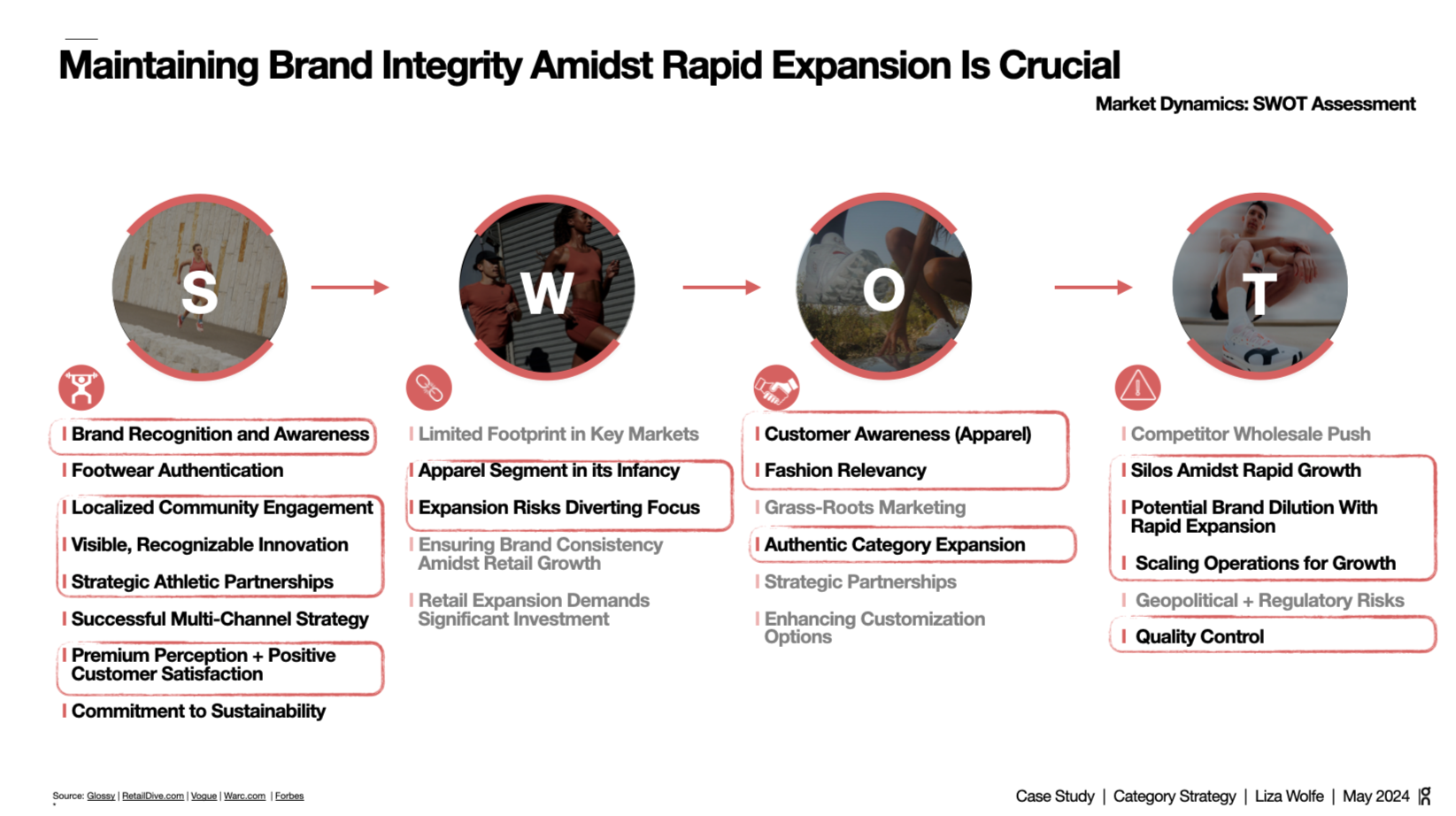 On's competitive advantages are defensible: footwear authentication, visible recognizable innovation, premium perception, a genuine sustainability commitment, and localized community engagement that larger brands struggle to replicate at scale. The weaknesses aren't about the brand itself. Apparel is organizationally in its infancy. Expansion risks diverting focus from the core business. Customer awareness in apparel is low. The threats that matter most aren't external competitors, they're internal: silos forming as the business scales faster than its processes, potential brand dilution from moving into new categories before existing ones are fully owned, quality control eroding when speed is prioritized without structure. The implication is clear. Fix the internal foundation before accelerating the external range.