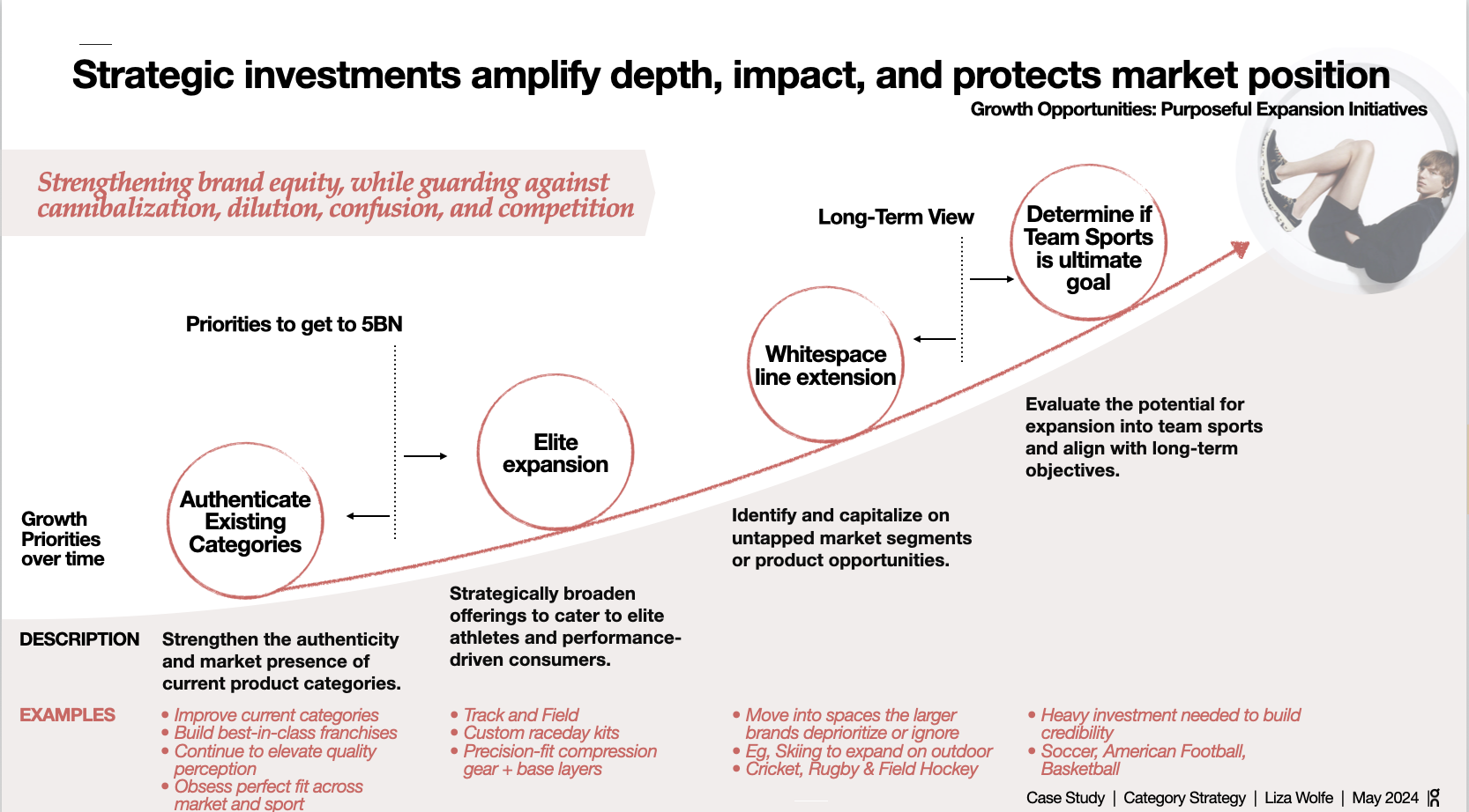 Body: The instinct in a growth mandate is to expand — new categories, new consumers, new markets simultaneously. That's how brands dilute. The strategic priority sequence here is deliberate: authenticate existing categories first, build best-in-class franchises, elevate quality perception. Then pursue elite expansion into track and field, compression, raceday. Then identify whitespace where larger brands have deprioritized or ignored. Team sports — soccer, basketball, American football — is a long-term question that requires heavy investment to build credibility. Doing it before the foundation is solid doesn't accelerate growth. It fragments it.